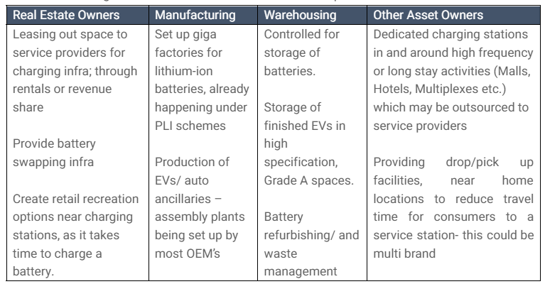 As it has been clear with the state and federal policies, the growth of EV is dependent on multiple eco-system factors, including real estate development rules, manufacturing and storage capabilities of OEM’s, as well as charging infrastructure. It therefore, creates opportunities across various segments of the value chain and we have captured some of these below: